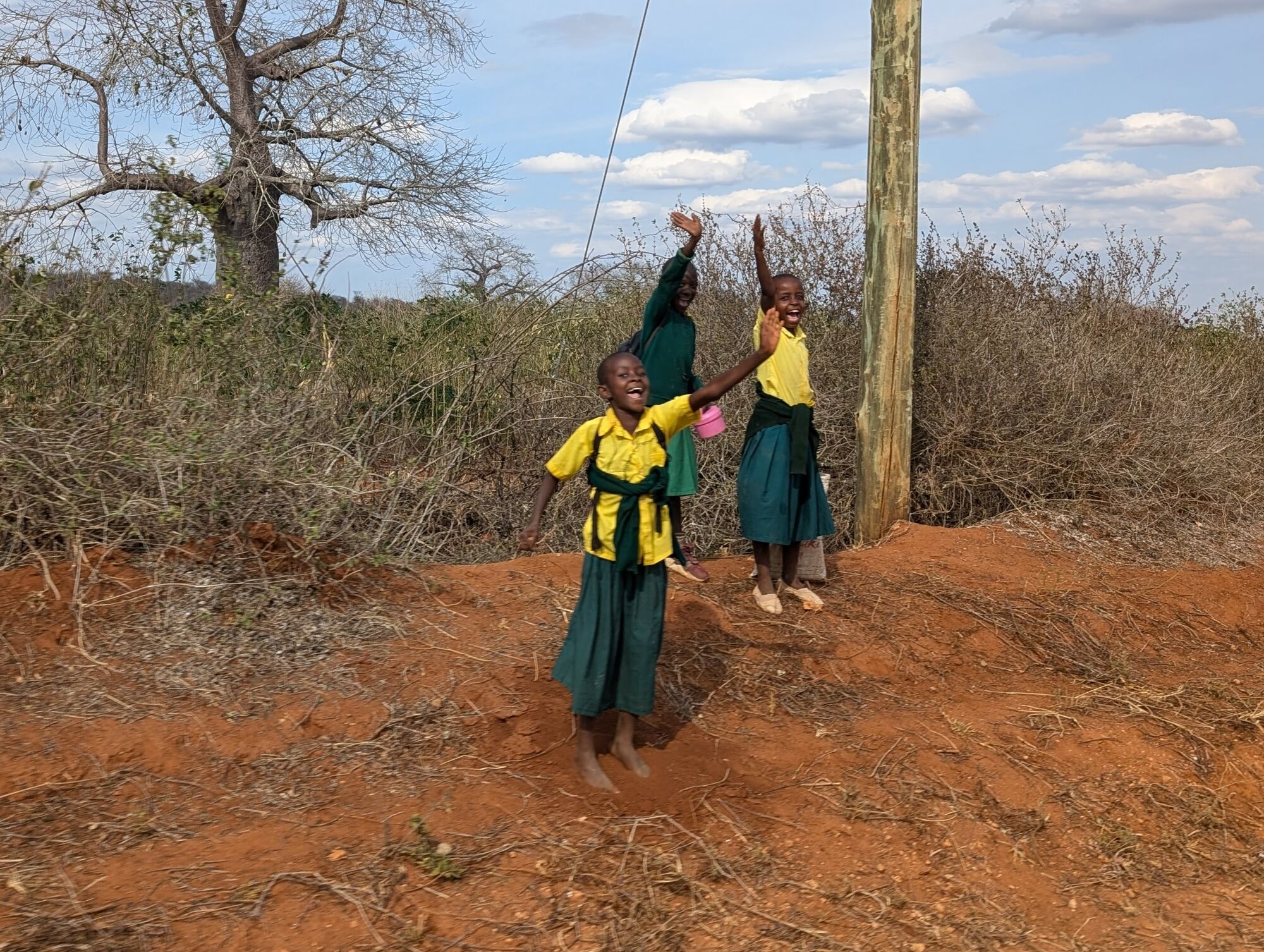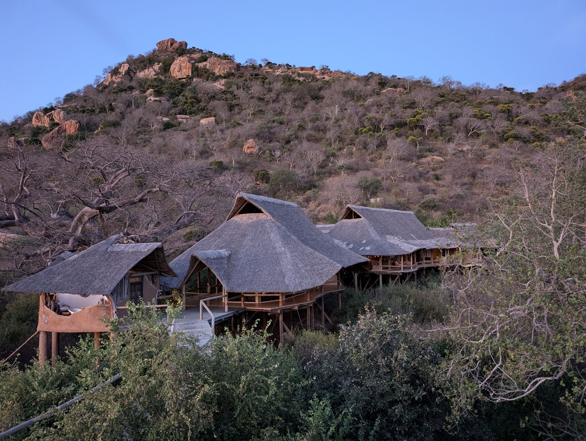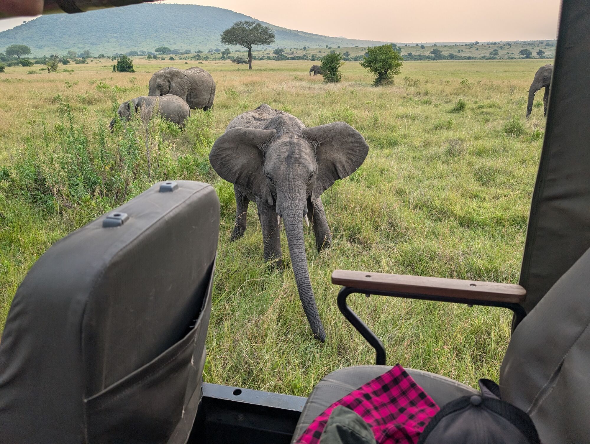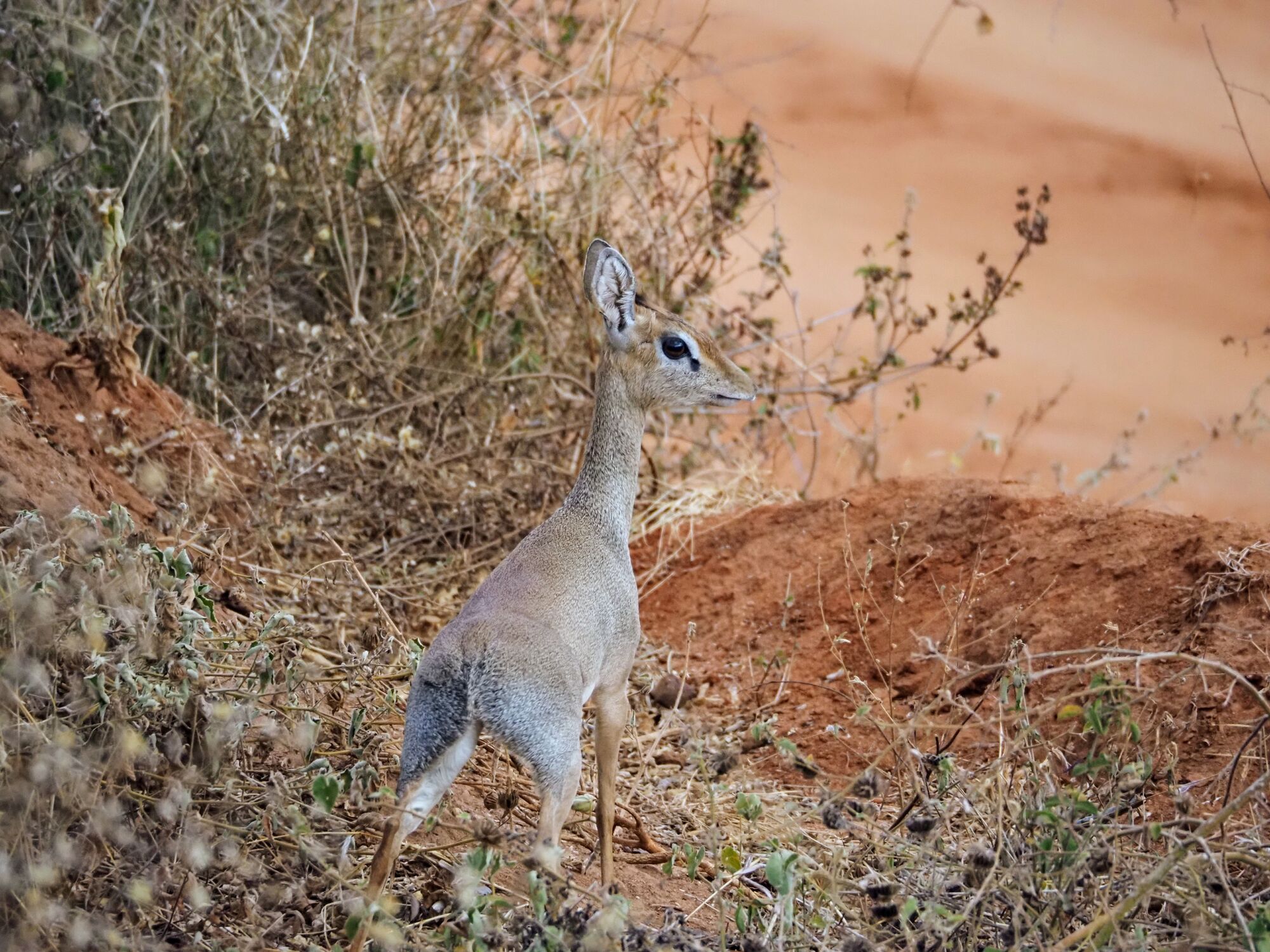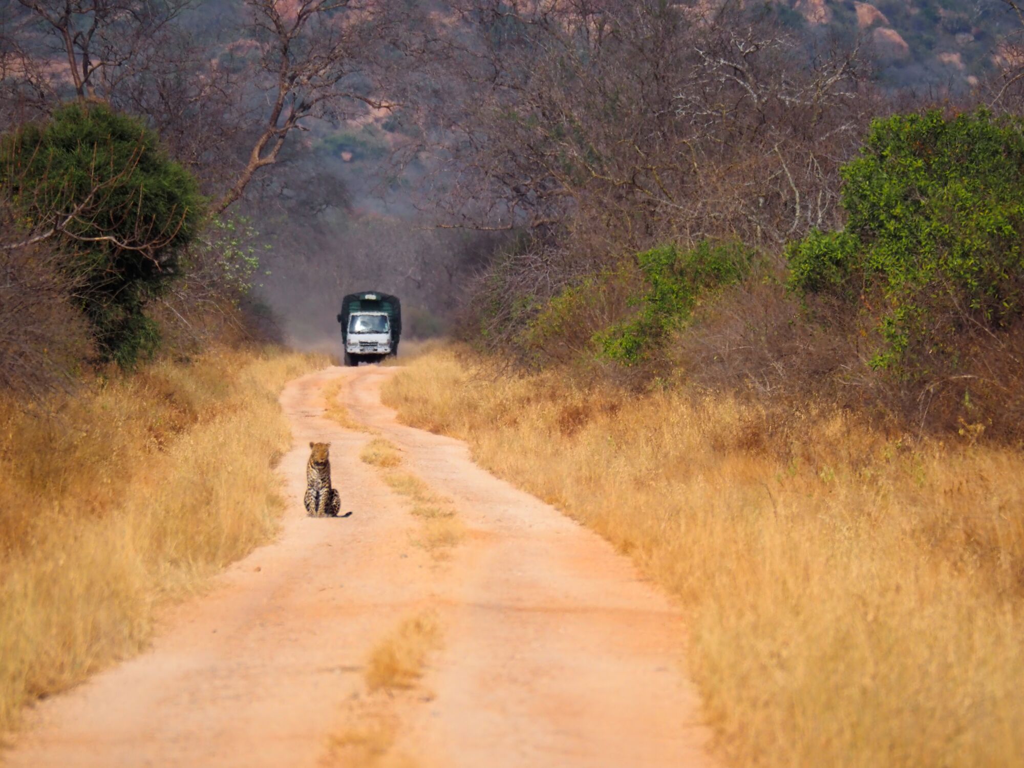 The drive itself was interesting enough. We particularly loved the incredibly friendly people along the road, especially the kids on their way home from school.More interesting sights on the road. On the way back we had several very entertaining experiences, including driving down the highway on the wrong side of the road to avoid a humungous traffic jam!.One of the very first animals that we saw was this leopard chilling on the road. It's extremely rare to see them in this part of the country, so we felt very lucky.But then, to our enormous surprise we saw another one as we drove into the camp!Two other animals of note in this area were antelope. First, they have a mini kudu. Considerably smaller, but otherwise looks the same as ours. And then the more well known dik-dik. An absolutely TINY little buck that we'd see everywhere.We stayed in a little private camp just the six of us and it was STUNNING. Beautifully built into the clasic hills on a raised platform. We were blown away by how nice it is.It turned out tha the camp had a resident genet that the staff love. We heard something running on the first evening but couldn't figure out what it was. Then in the morning I saw the sneaky thing grabbing some milk from the coffee station! Upon questioning it turns out that it lives there and is well loved.