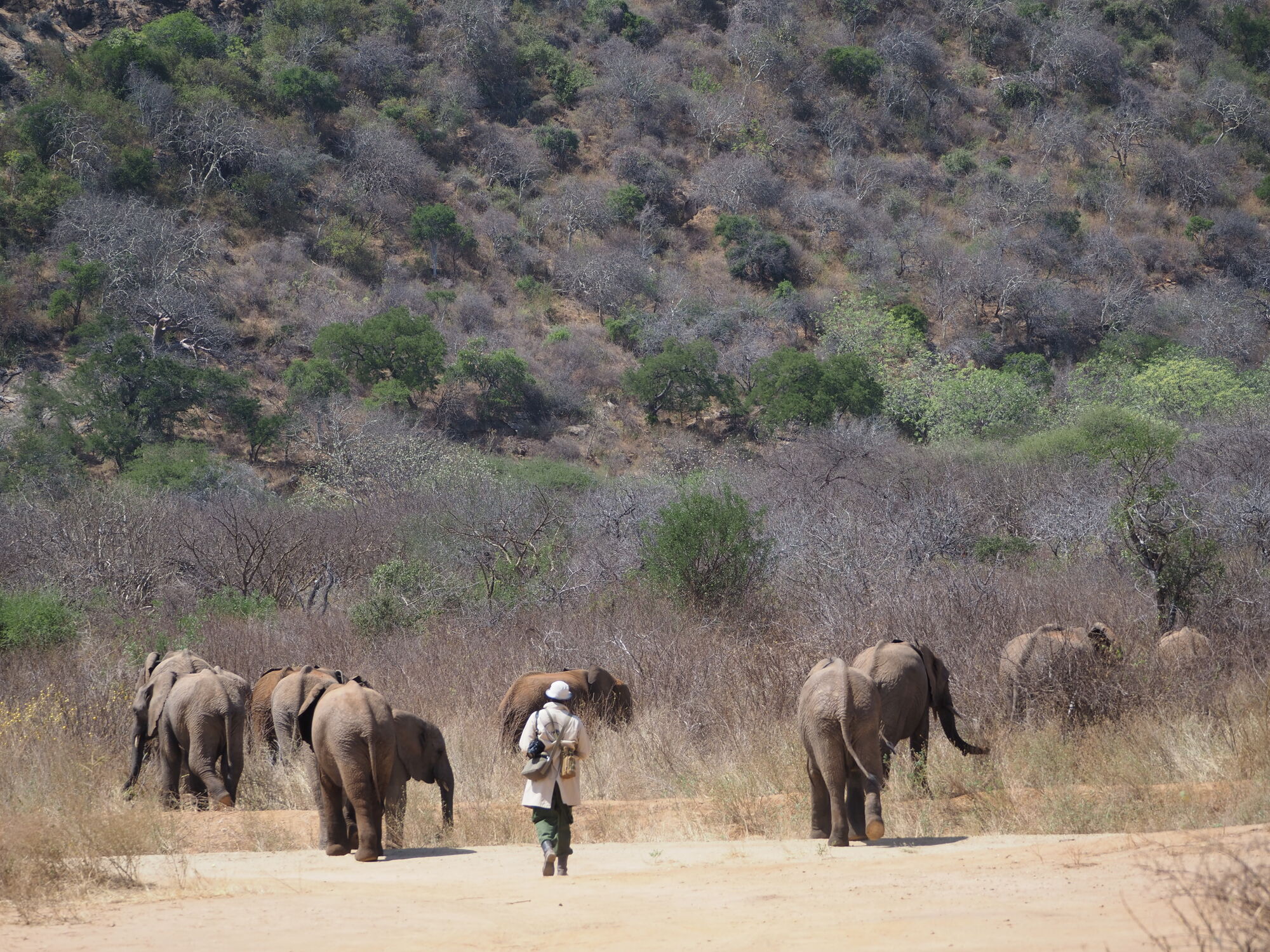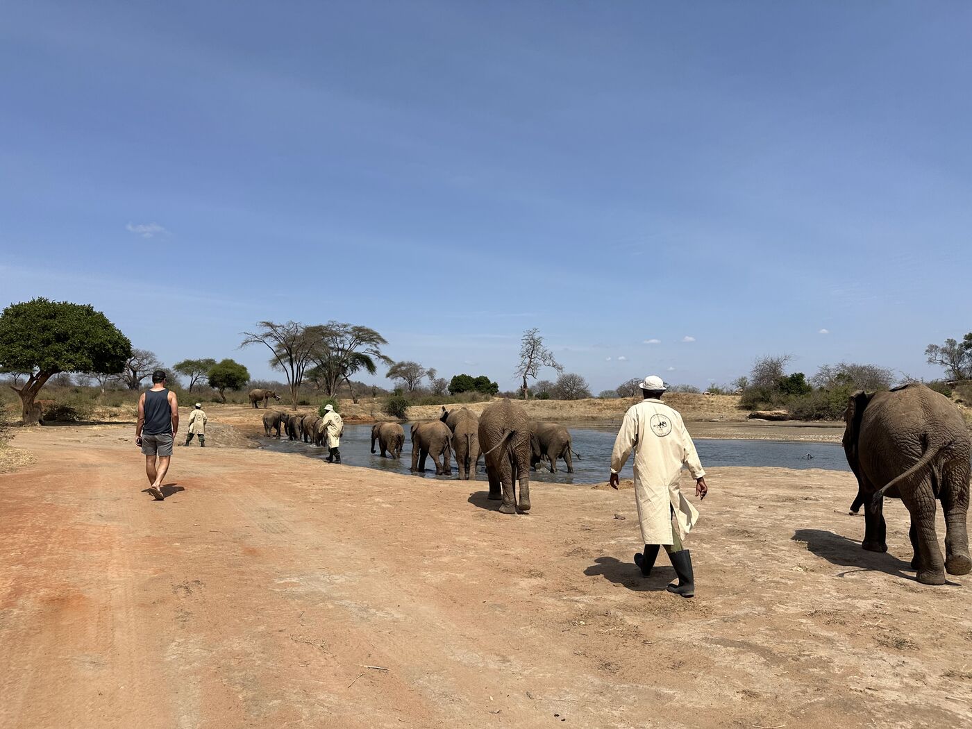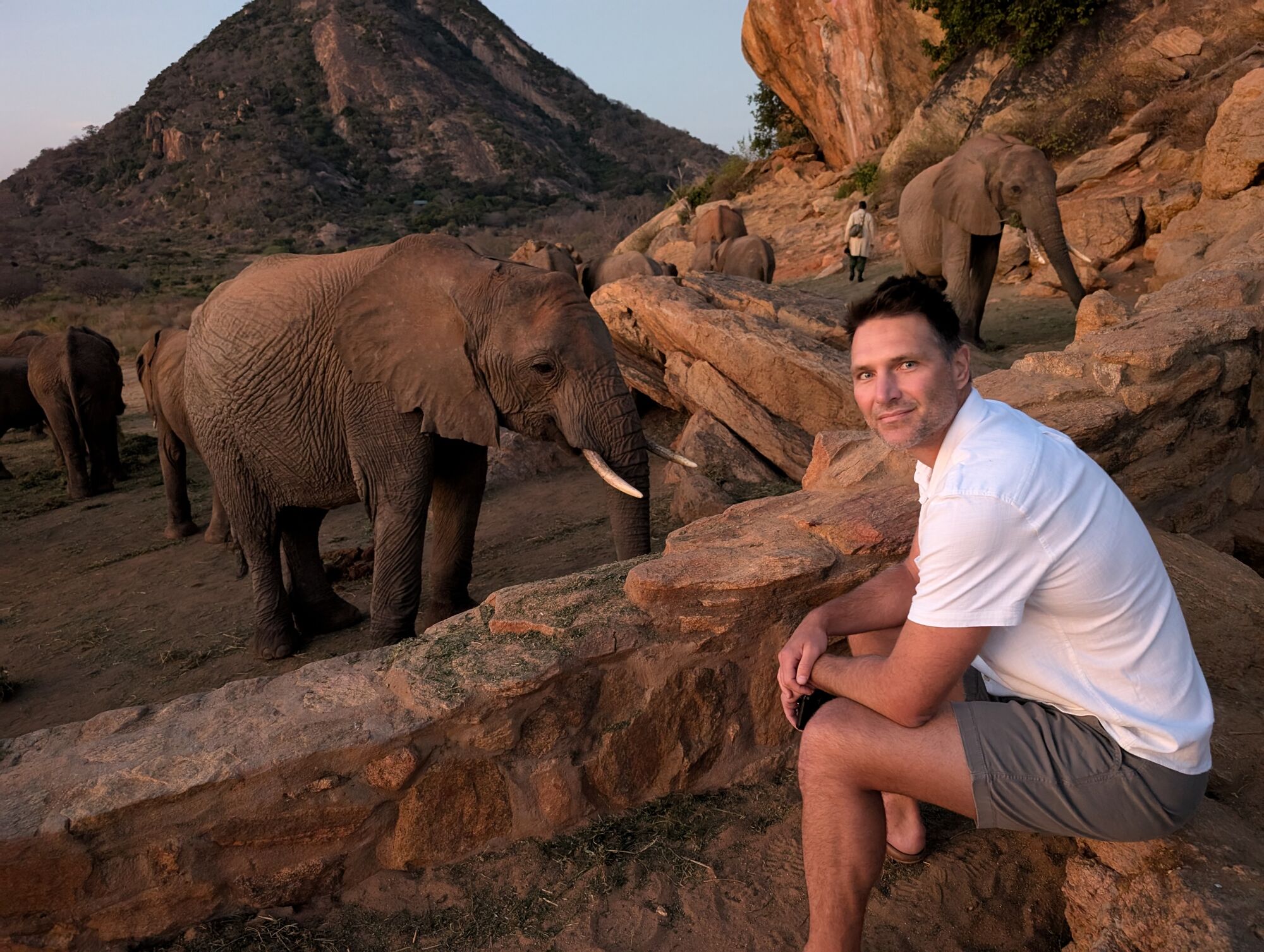 Each morning we would arrive before sunrise and see the morning feed. Both the little orphans who sleep in stocks (safe) and partially, or even fully, wild elephants turn up to get a nice feed.It was extremely beautful, and special to hang out so close to them.And then the keepers would walk off into the bush with the orphans for a day browsing, and learning to be wild.At lunch they'd turn up for another feed, a bath, and a sand bath.This is the head keeper, Benjamin. He is legit one of the coolest humans that I've ever met. He has an incredible calm, wise presence and we loved talking to him. But he also has an amazing way with elephants. He can read them, and seems to have the ability to fully communciate with them using soft whistles.