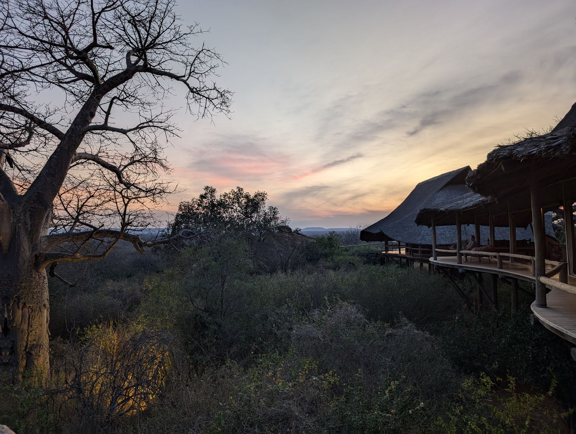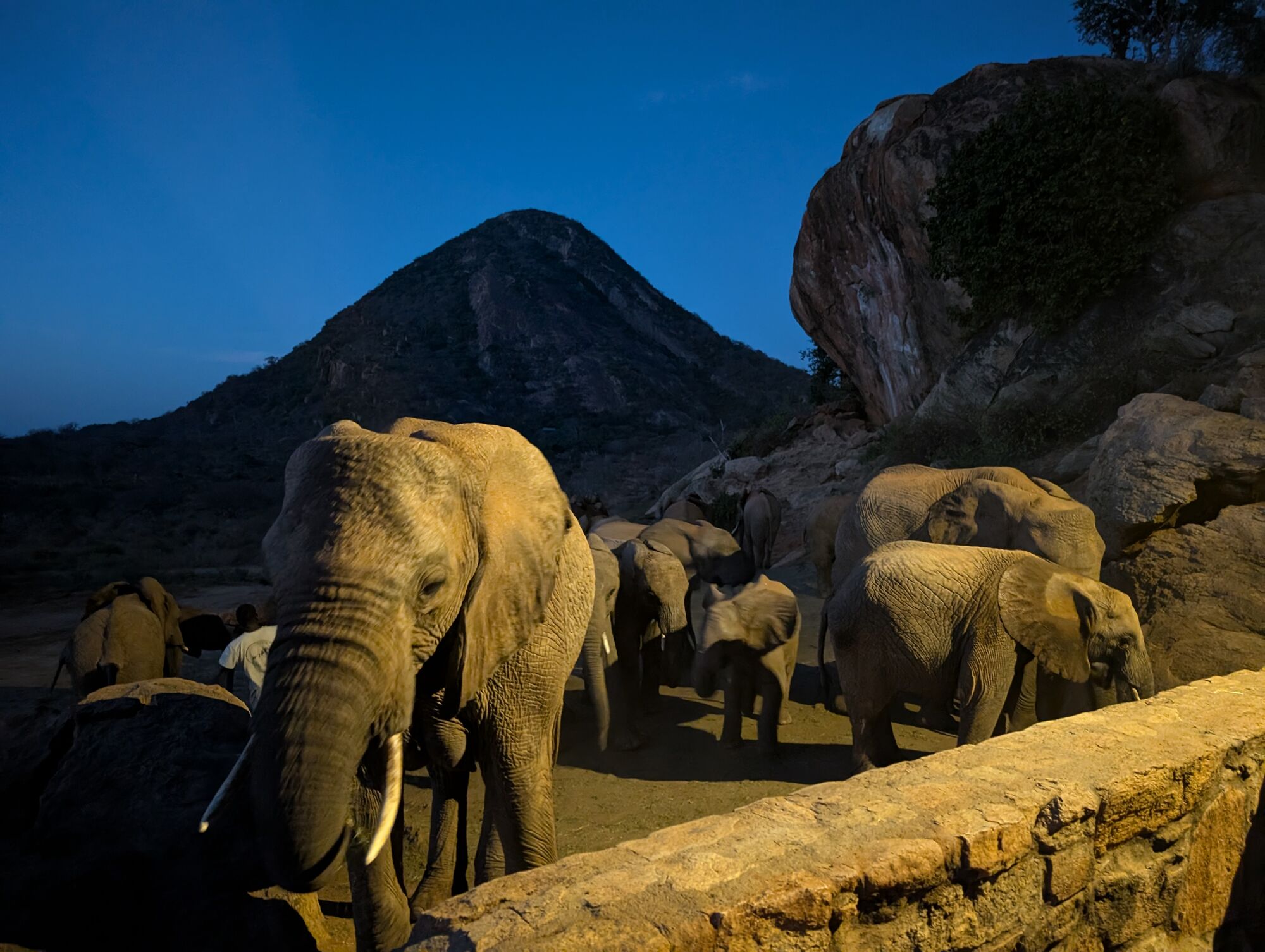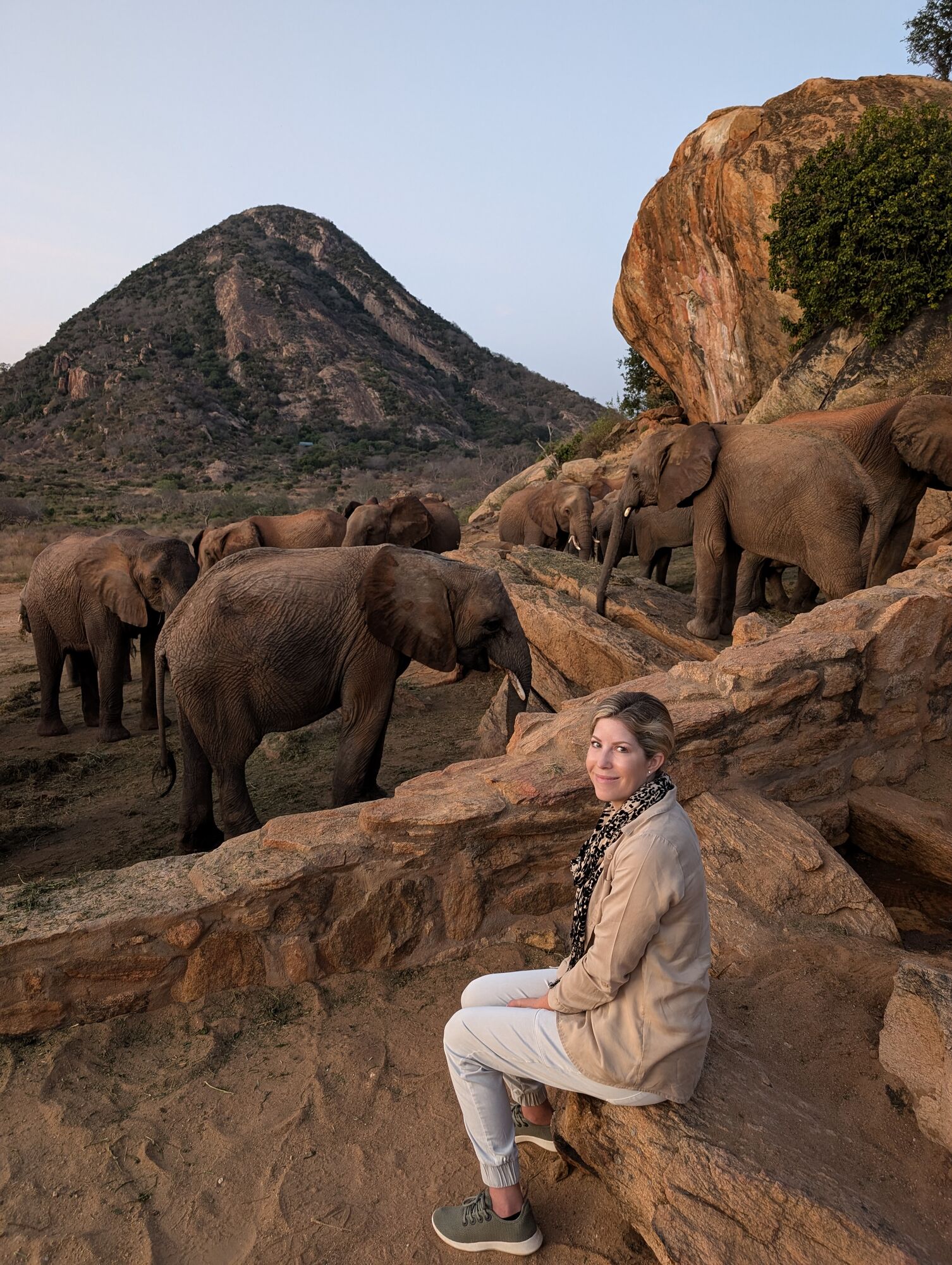 We also drove around the part a little. It's a very dry area, so there wasn't much game. But there are plenty of elephants and one evening we watched about 60 from several herds arrive to drink. They get really excited and storm down to the water.On one of our exploration drives we came across this huge baobab tree.On the last evening our camp crew organized an amazing night. Starting with surprise sundowners on the rocks (we could see Kilimanjaro far off in the distance). And then a beautfil dinner set up near their rocky pool.The staff at Ithumba Hills Private Camp were absoutley stellar.