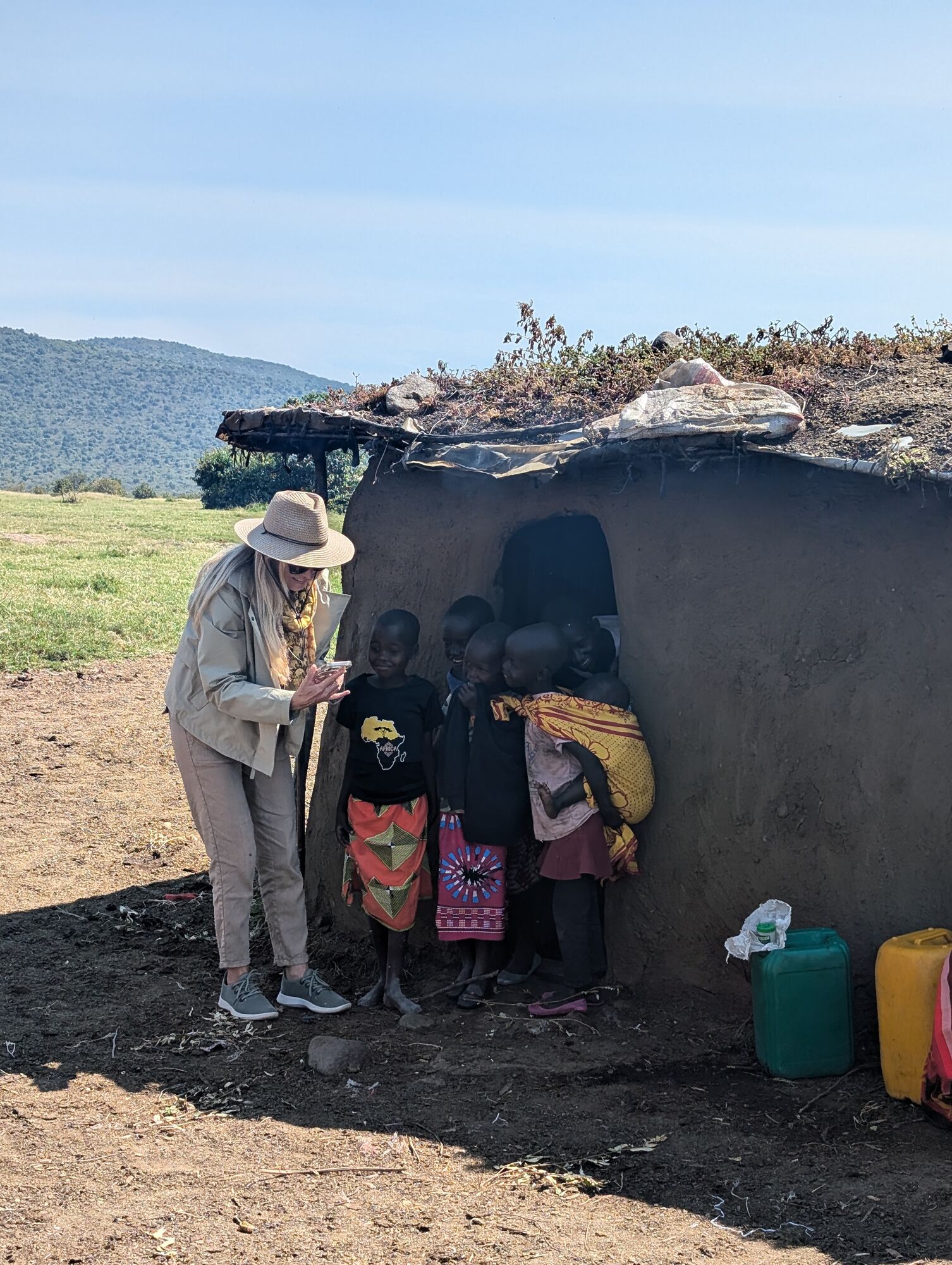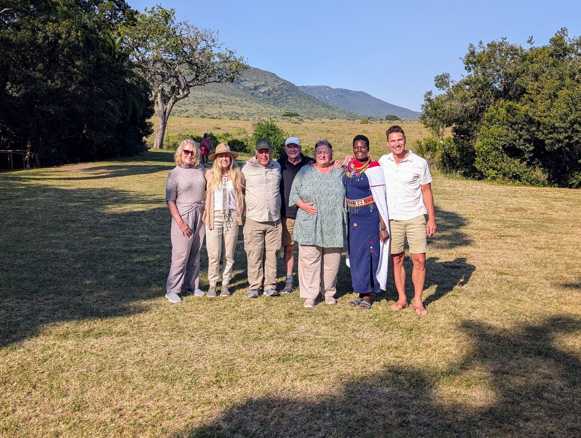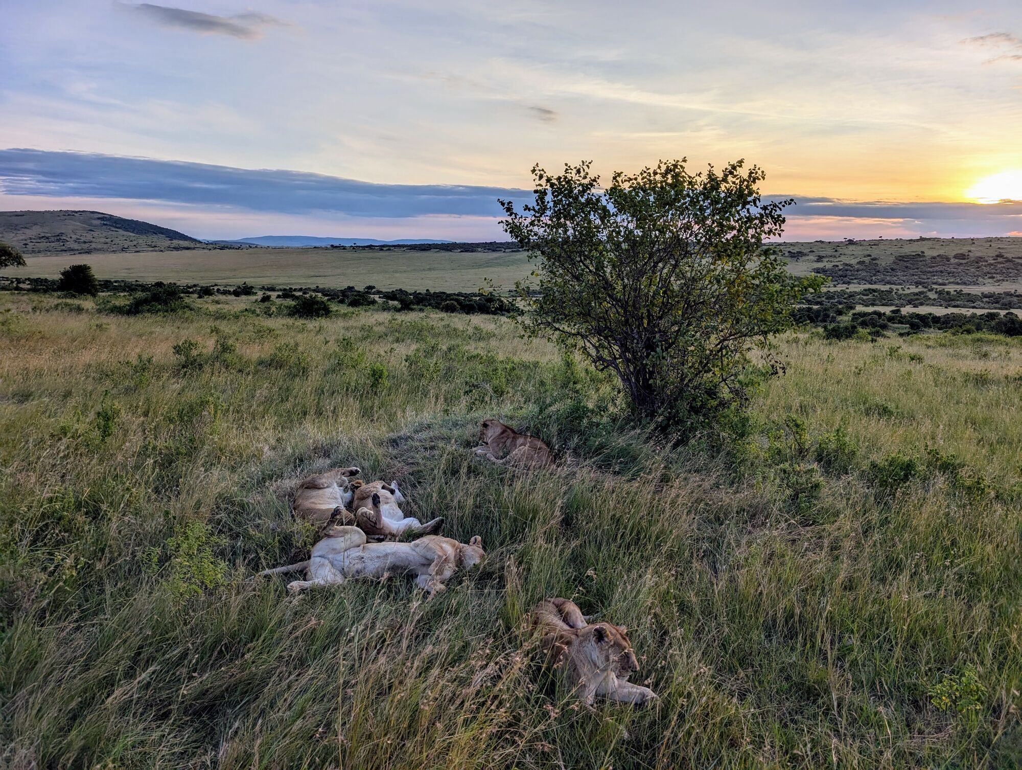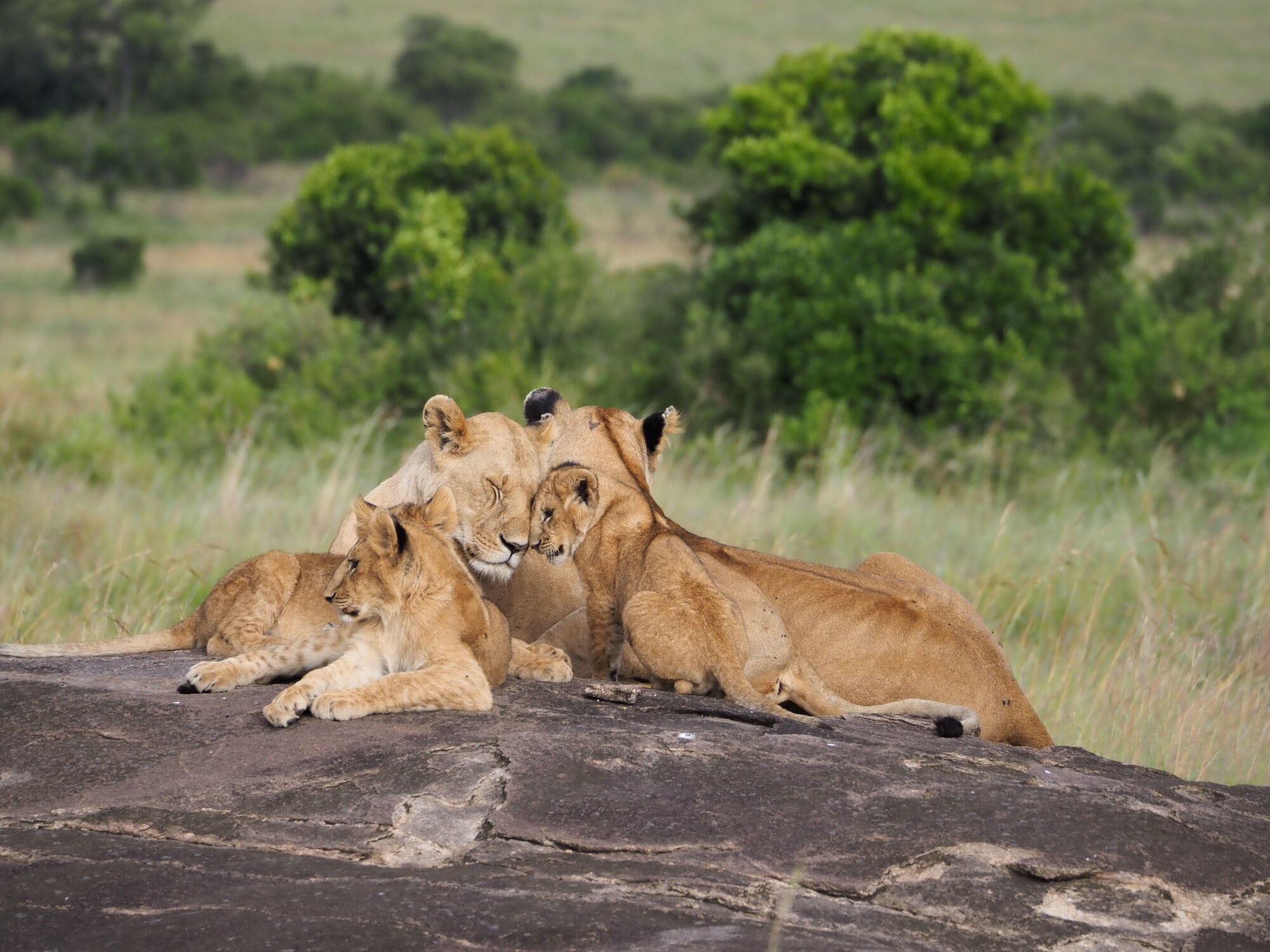 The open grasslands were extraordinarily beautiful. And not at all like the bush that we are used to in South Africa.I adored these morning views and took tons of pictures a lot like this one.These hills are known as the "sleeping warrior". You can see him lying down, with his head on the left.We had tons of excellent lion sightings while in the Mara. Starting with this lazy lot on our first evening.The highlight was this pride, which had set up camp on these rocks with quite a lot of cubs. We'd come by every day.One day we saw the lionesses get up with intent. As always it was extremely exciting to follow them and watch them looking for a meal.They eventually noticed two dagga boys and surrounded them. A quick chase ensued but ended when the lead lioness tripped!Camp life was fantastic. We were very well treated, had excellent meals, and adored the staff.With Janet, our camp host on our way out. They really were special.Life in the bush was also very comfortable. Here another picnic brunch somewhere out in the bush.One of many beautiful spots for a sundowner or a snack.A very special experience was being taken to the home village of our tracker. It was truly amazing to see the life that he had lived, and that his enormous family continues to live.Showing the kids the photo. We also got a tour of one of the huts and shown a bit of how life is lived there..Demonstrations in the village.We loved our time in the Masai Mara, and I really hope to return one day.