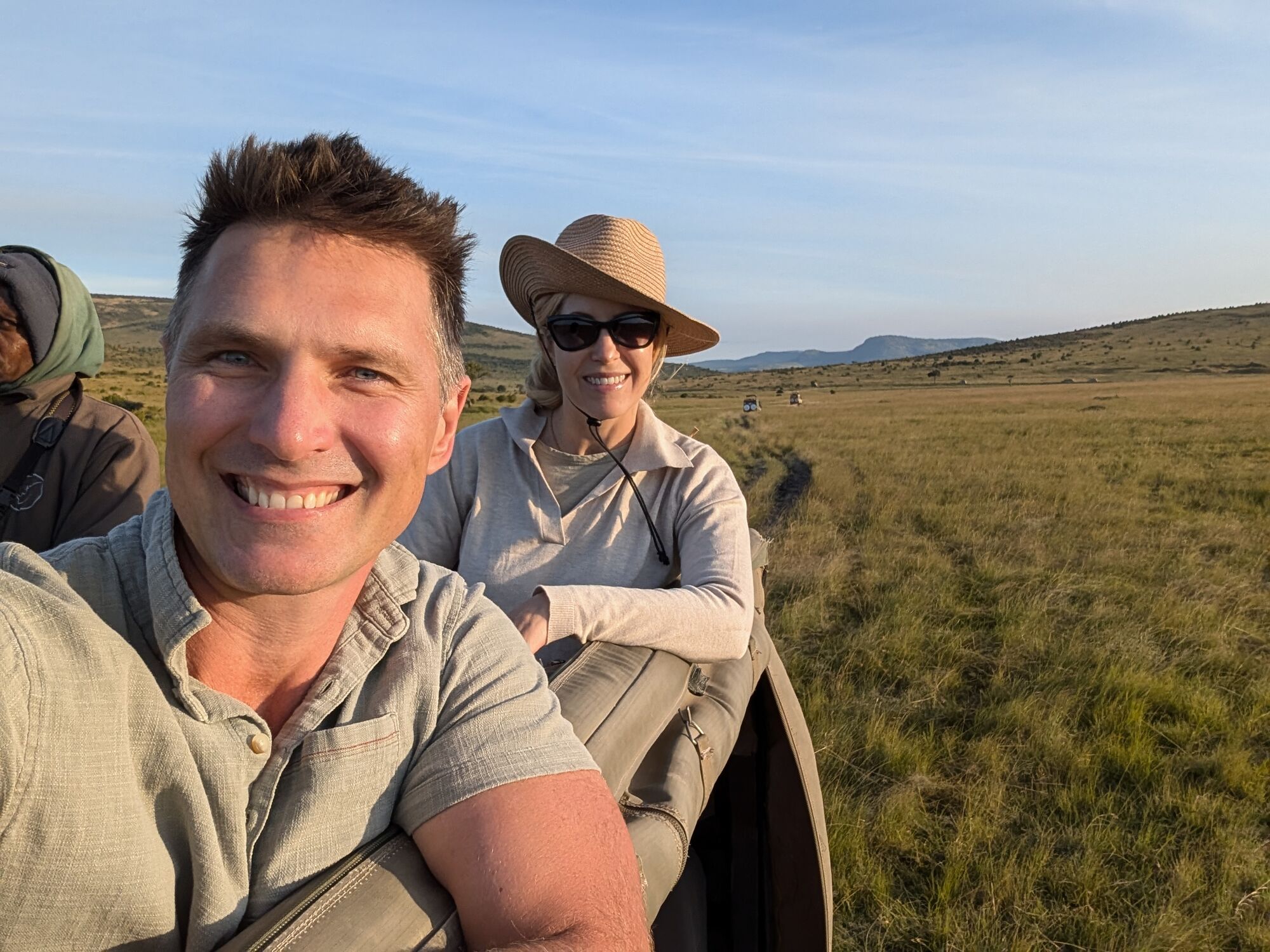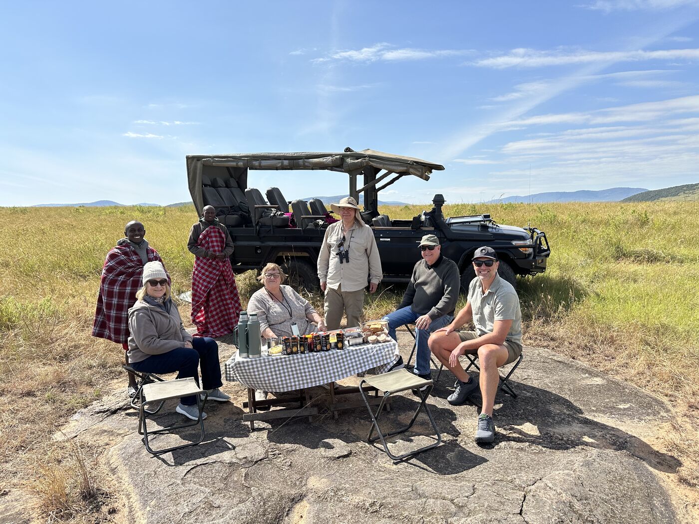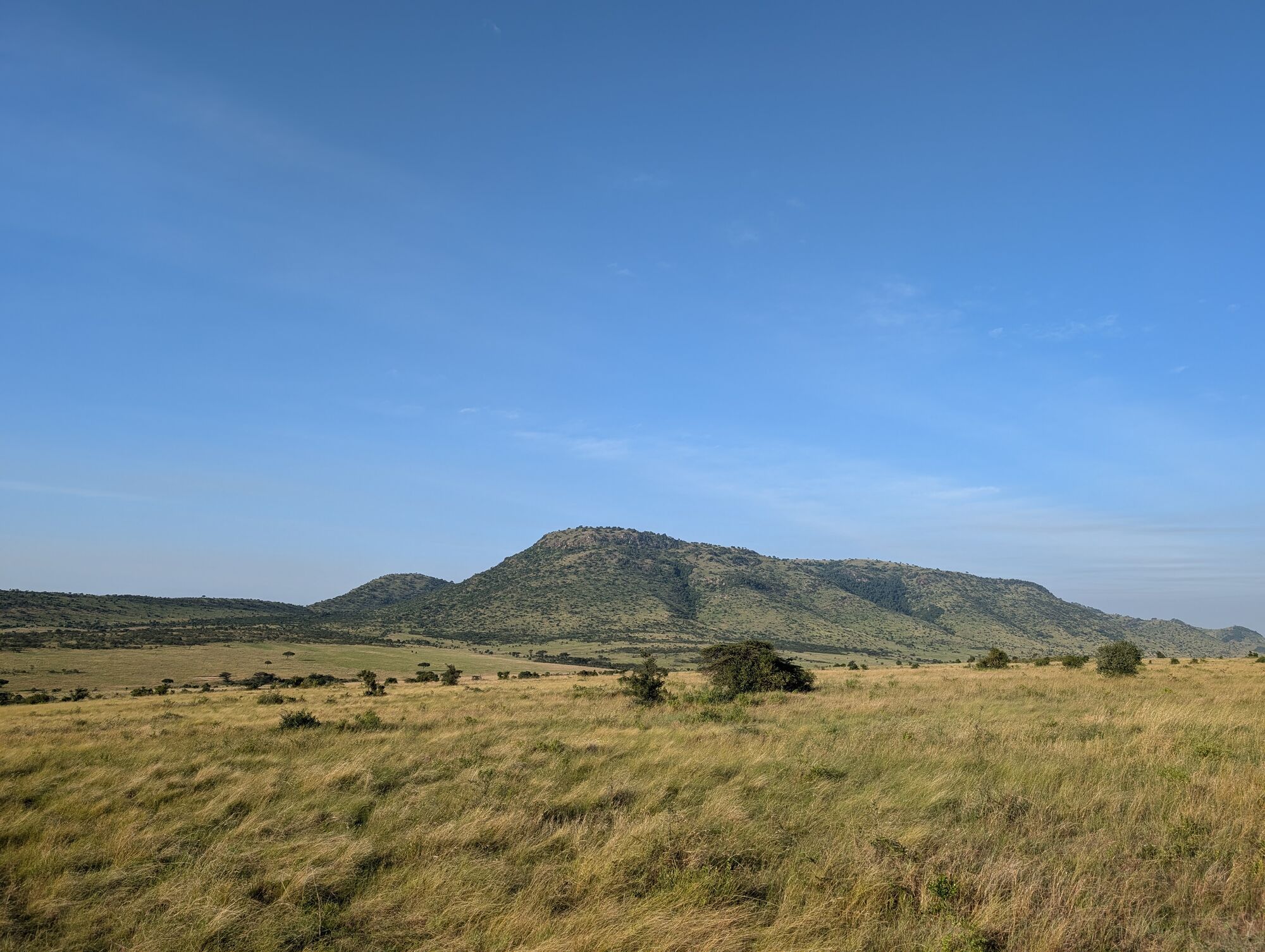 The open grasslands were extraordinarily beautiful. And not at all like the bush that we are used to in South Africa.I adored these morning views and took tons of pictures a lot like this one.These hills are known as the "sleeping warrior". You can see him lying down, with his head on the left.We had tons of excellent lion sightings while in the Mara. Starting with this lazy lot on our first evening.The highlight was this pride, which had set up camp on these rocks with quite a lot of cubs. We'd come by every day.One day we saw the lionesses get up with intent. As always it was extremely exciting to follow them and watch them looking for a meal.They eventually noticed two dagga boys and surrounded them. A quick chase ensued but ended when the lead lioness tripped!Camp life was fantastic. We were very well treated, had excellent meals, and adored the staff.With Janet, our camp host on our way out. They really were special.Life in the bush was also very comfortable. Here another picnic brunch somewhere out in the bush.One of many beautiful spots for a sundowner or a snack.A very special experience was being taken to the home village of our tracker. It was truly amazing to see the life that he had lived, and that his enormous family continues to live.Showing the kids the photo. We also got a tour of one of the huts and shown a bit of how life is lived there..Demonstrations in the village.We loved our time in the Masai Mara, and I really hope to return one day.
