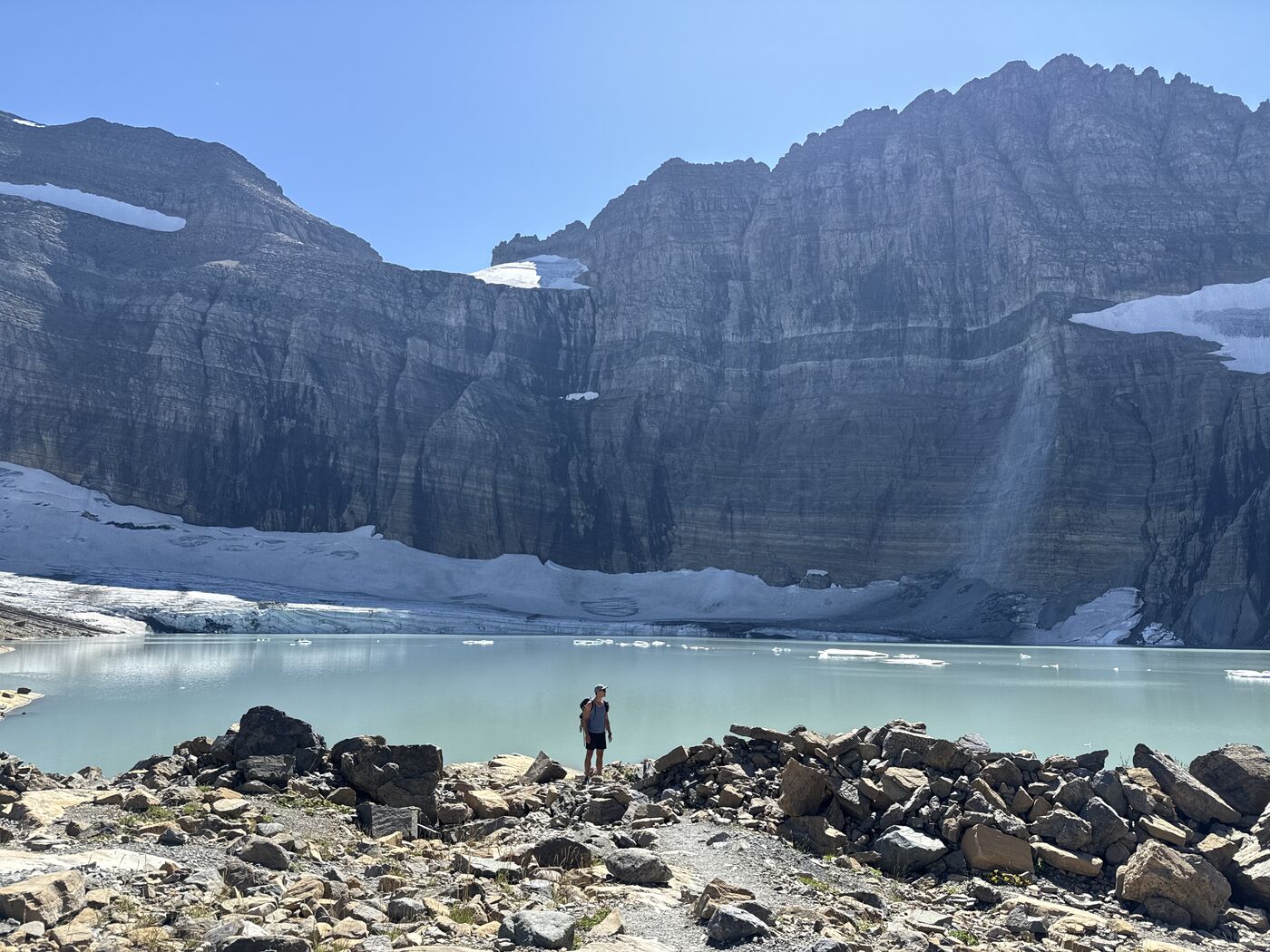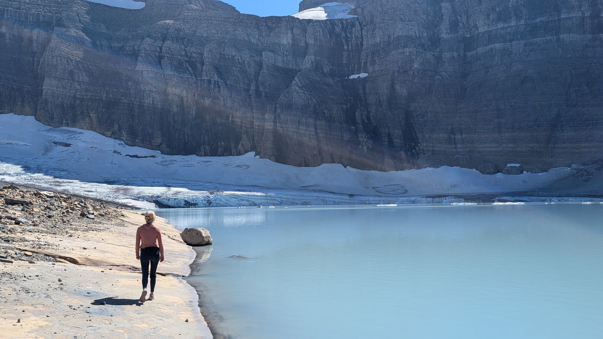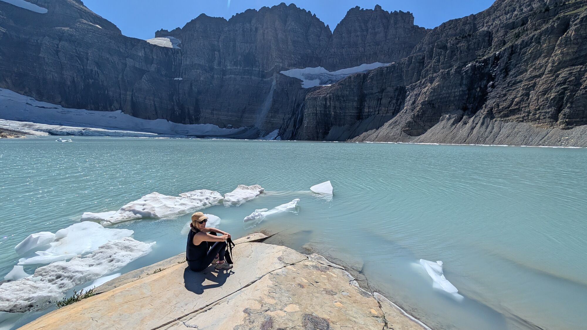 We stayed at the wonderful Many Glacier Hotel, and were super lucky that access to the area was restricted for construction. The hotel is stunning and right on the Swiftcurrent Lake (see the hotel on the far right)We lucked out and got a room with this stunning view.First thing in the morning we headed out for a hike. To shorten things, and to make it more interesting, we took a boat over the lake. In fact it was a boat over the Swiftcurrent, a walk, and then a boat across the next lake too.Almost immediately we saw a grizzly bear making it’s way along the hillside. This was the first either of us had ever seen, and also rounded out the trio (grizzly, black, polar) for the trip – very exciting!We then headed up the trail toward Grinnell Glacier. The views of Grinnell Lake and the mountains were magical all the way up.The first wildlife we saw was this stunning bighorn sheep.He was walking along the trail and totally unbothered by us waiting.We eventually topped out at Upper Grinnell Lake, which was gorgeous. Really cool to have all these big blocks of ice floating around.After a beer and some lunch, we started to make our way along the lake shore to check out the glacier.We walked all the way over to touch the glacier itself.On the way back down we came across this mountain goat, also not at all bothered by our presence.And then a moose! Fortuntely this was a fair distance from the trail.Sunset from our balconyAnd then we spotted a beaver cruising slowly past!Next morning I was up fairly early for a run.I went to Grinnell Lake, which we had been looking down on during our hike the previous day. I had the place all to myself.We rented a kayak and paddled all over the lake exploring.We finally got a shot of the kingfishers. At the start of this trip we didn’t even know there were kingfishers here. They’re very shy so we struggled to get photos.And then we also saw a beaver! He was quite brave when we just sat still.We drove the famous Going-to-the-sun road through the park. Very busy!That evening we saw this black bear chowing down on berries near the hotel. He was unconcerned by hikers.On the last morning before leaving I shot out the door towards Iceberg Lake. The lake is in this huge amphitheatre and the approach was stunning. The lake is really incredible. Situated at the base of these huge cliffs.And again, I had the entire place to myself.