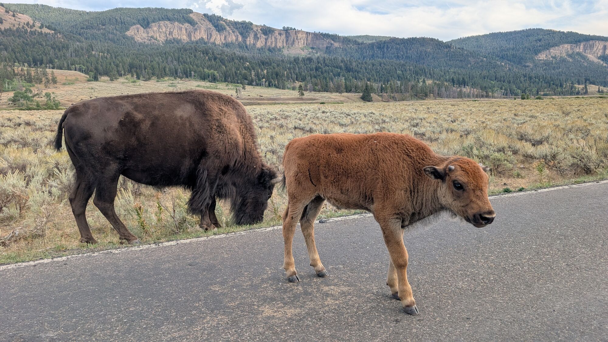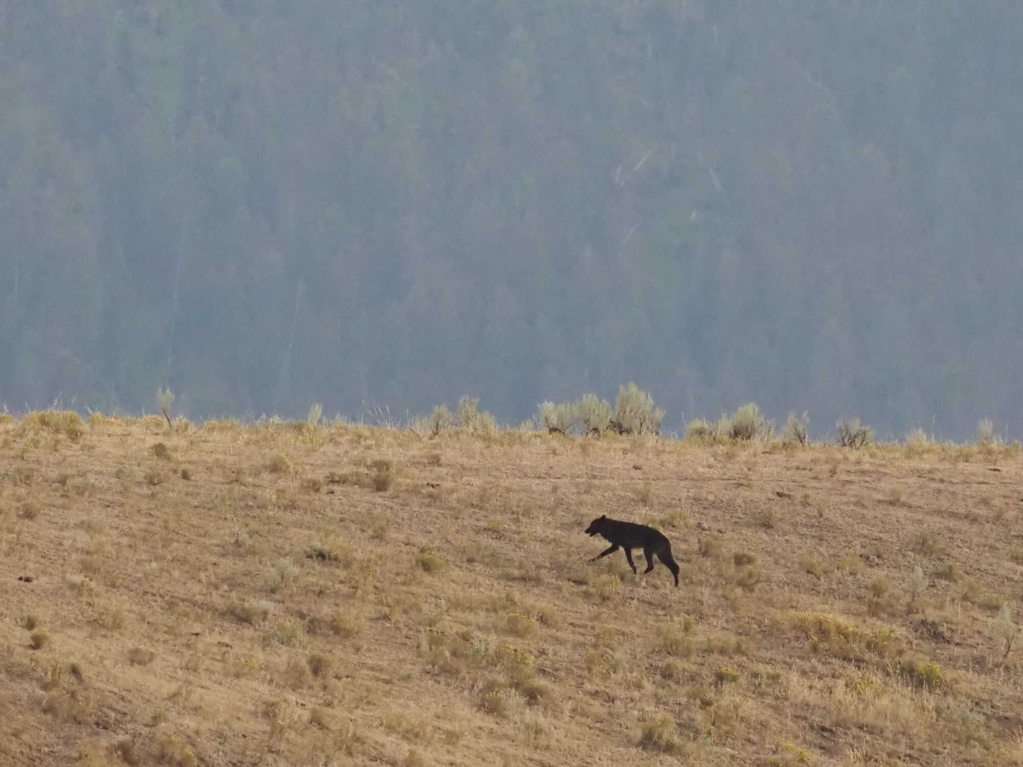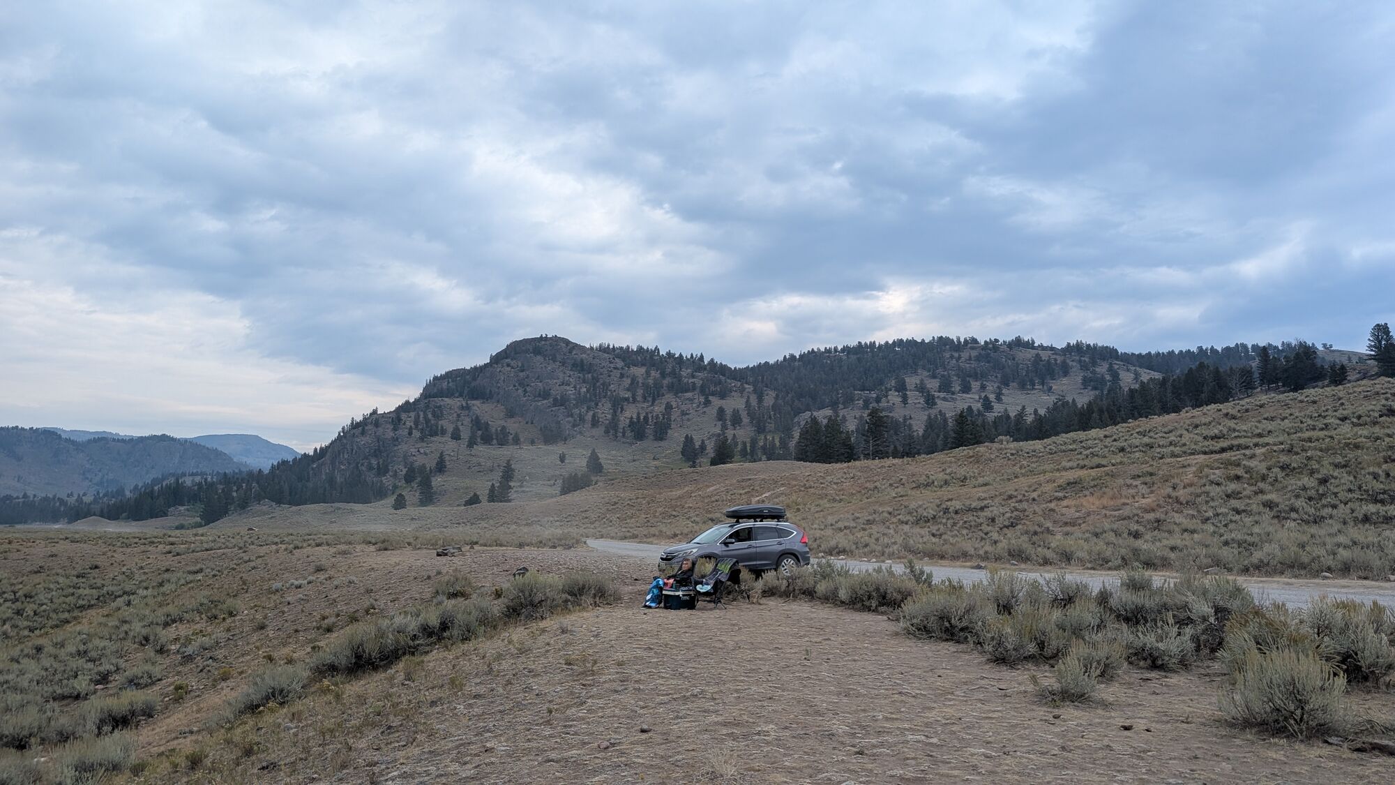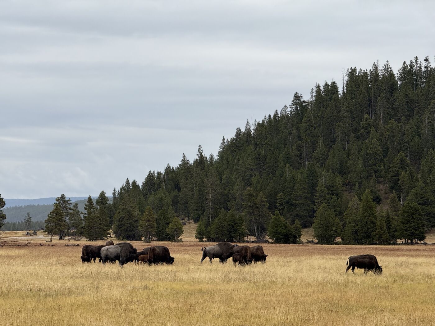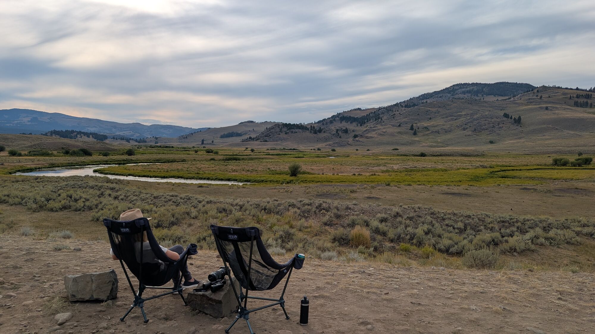 From Glacier we drove down the length of Montana to get to Yellowstone. It was a very interesting, and generally beautiful drive. We really liked these huge open planes.We arrived fairly late, but still popped into the park and set up our chairs for sundowners.Next morning it was back into the park.We focused on wildlife on day 1 by driving the Lamar Valley, known as the Serengeti of Yellowstone. Neither of us had seen a bison in the wild, so it was fun to get some really fantastic sightings of them.During our drive we’d seen a really nice spot, off of the main road. So we headed back there and set ourselves up for sundowners with a view.Right away this big guy turned up and he ended up spending most of the evening hanging out with us.But he dipped when these two grizzly bears turned up! They had a big drink of water from the river.And then headed back the way they had come. Turns out that they had killed a bison just over the hill from where we were hanging out and they were headed back that way.We were really hoping to see wolves, and couldn’t quite believe out eyes when this one popped out of the bushes and trotted up the hill. Eventually a bunch more of them emerged, but they were MILES away. We’d heard that a lot of the time if you see wolves at all, it is like this.A bit later the wolf turned up again going in the other direction.We later heard that it had gone to investigate the bison kill, and been summarily chased away by the grizzly bears.Once all the action quietened down the bison turned up again, from where who knows.Everyone left and we warmed up some takeout before heading back to the hotel.Day two was mostly quiet with admin and lunch in town before heading into the park in the late afternoon. We were chilling, watching the bison carcas and hoping when suddely we saw the wolves chasing a bison down the hill in the distance behind us!The bison was more than a match for two wolves, seen here giving on a good kick.We settled in at our favorite spot for sunset again. Again we could see the rest of the pack in the far distance.Day 3 was a rainy travel day. So we dedicated it to the other great thing about Yellowstone – the thermals. Way more interesting and beautiful than we had expected. We especially loved a long walk around Norris Basin.We saw tons and tons of hot springs, geysers, and steam vents. We actually did check out Old Faithful, and found it underwhelming indeed…More lovely bison on the way South.