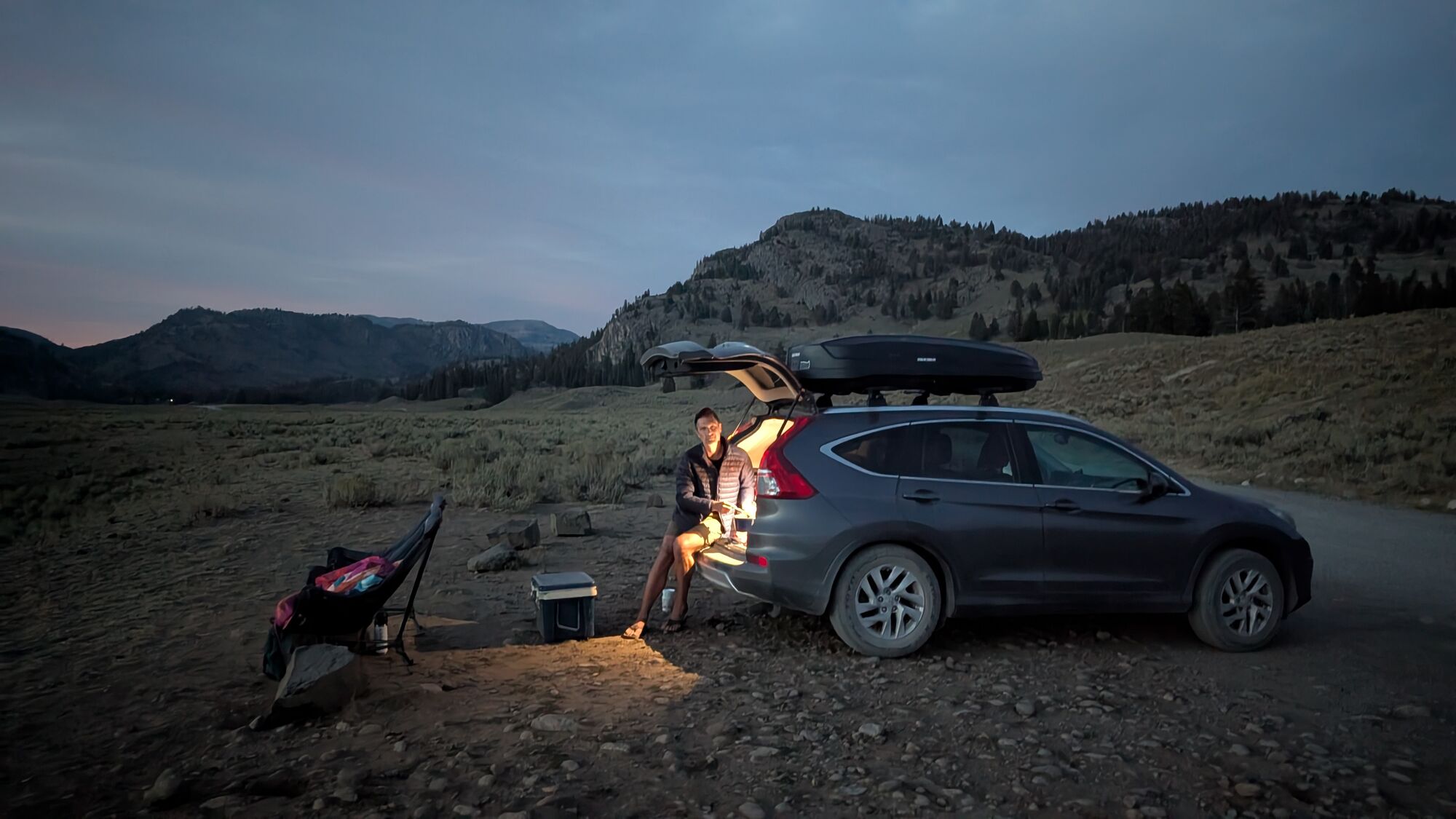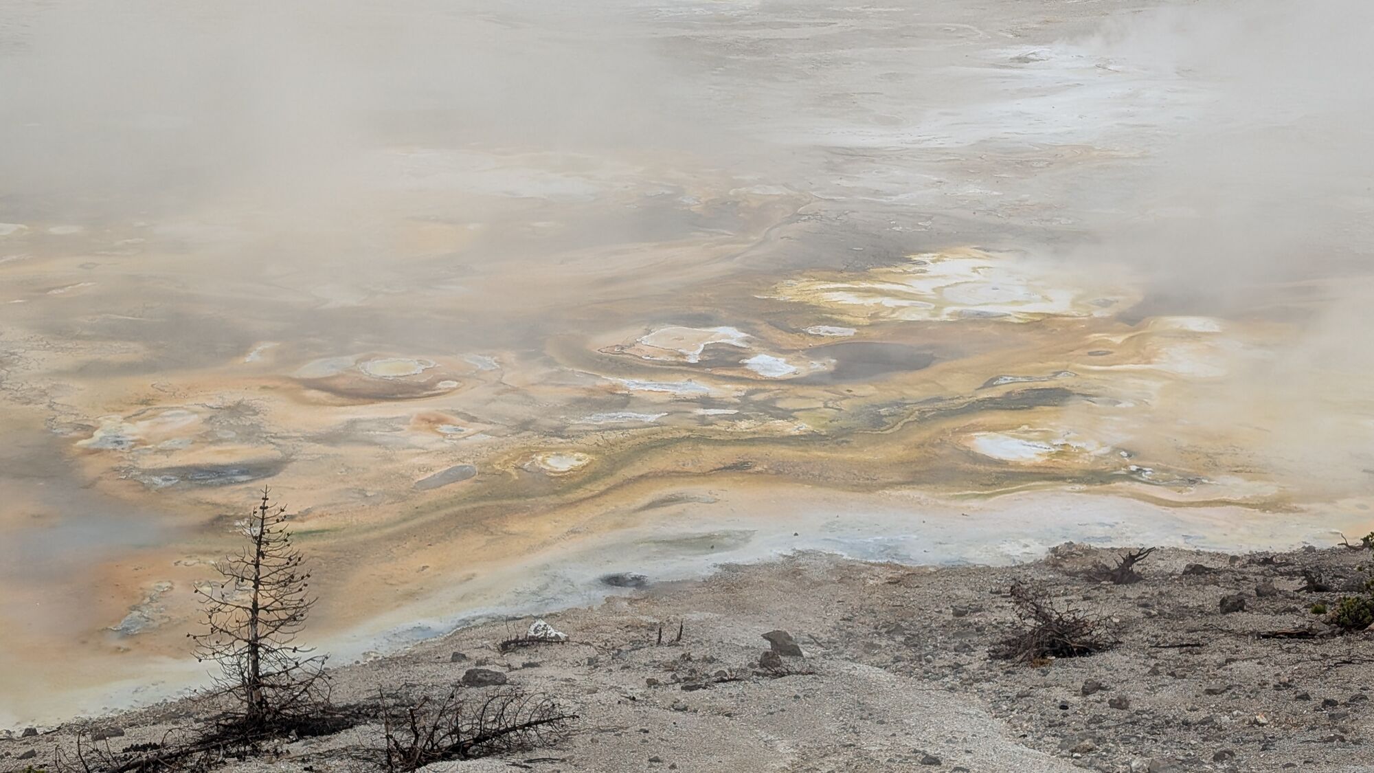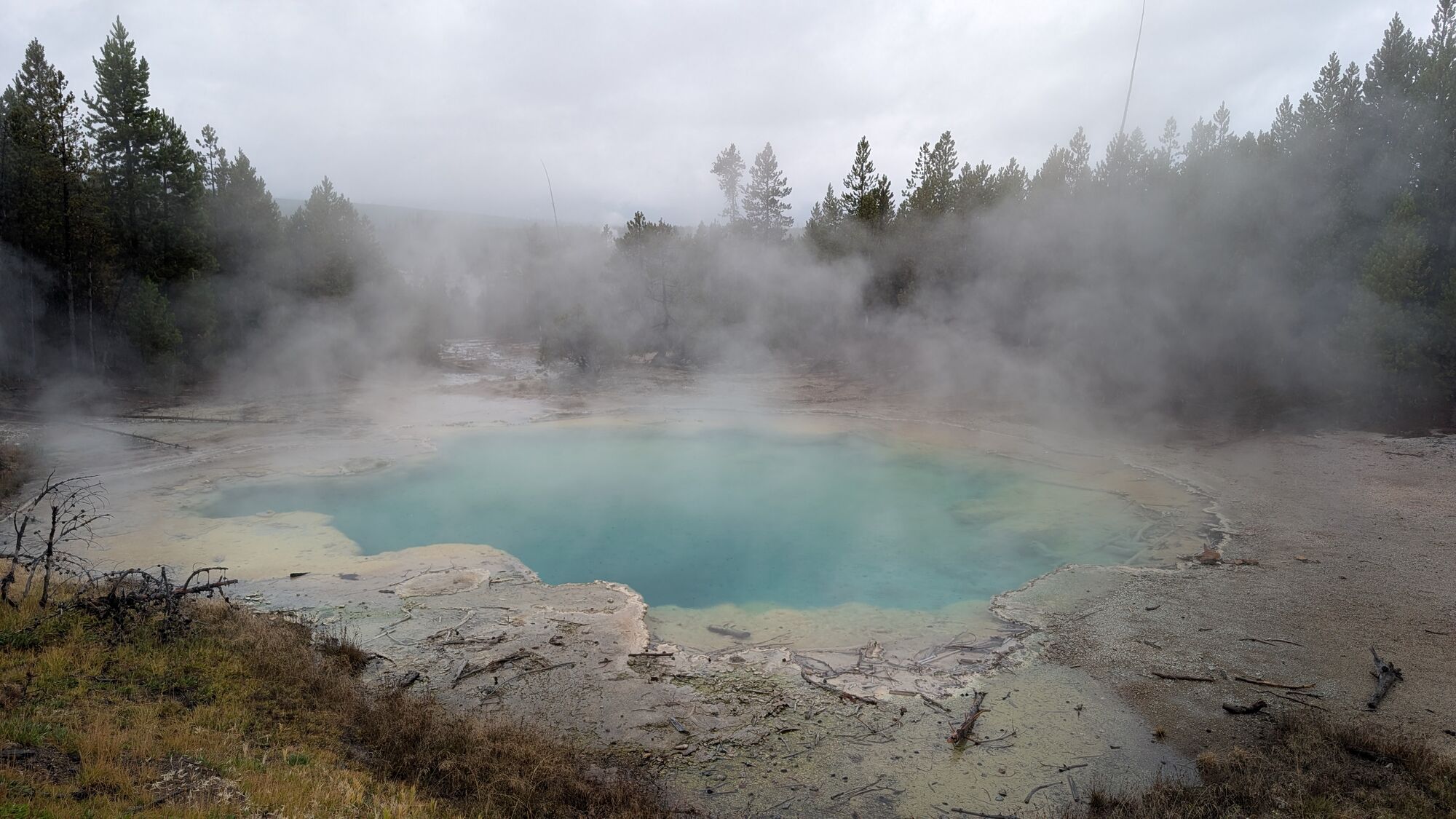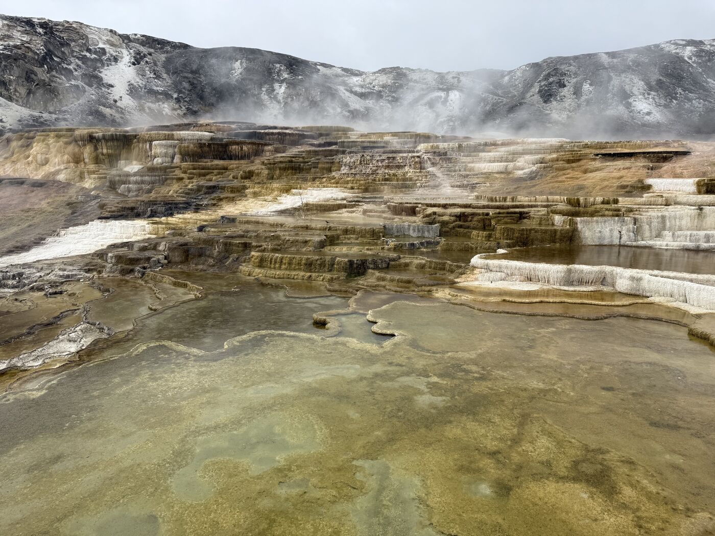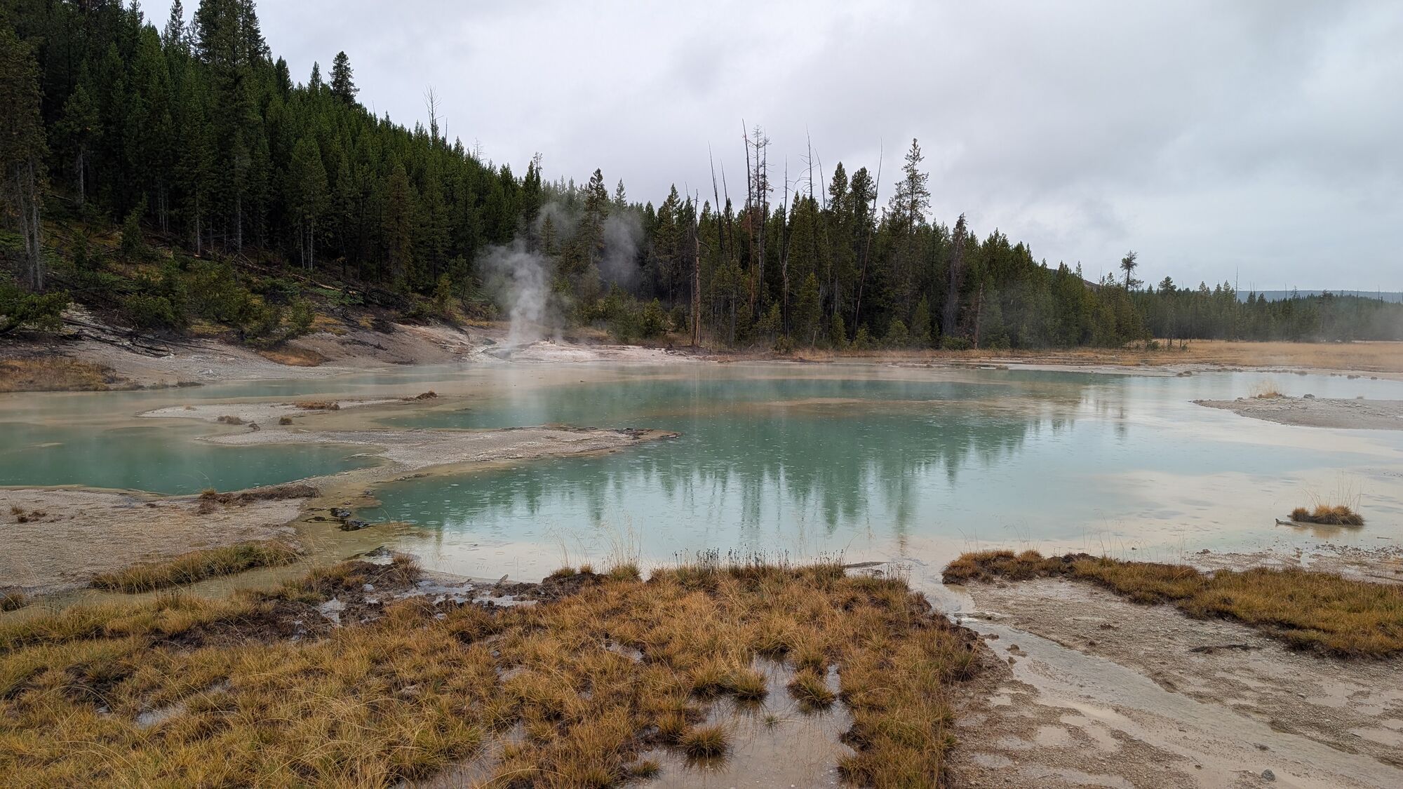 From Glacier we drove down the length of Montana to get to Yellowstone. It was a very interesting, and generally beautiful drive. We really liked these huge open planes.We arrived fairly late, but still popped into the park and set up our chairs for sundowners.Next morning it was back into the park.We focused on wildlife on day 1 by driving the Lamar Valley, known as the Serengeti of Yellowstone. Neither of us had seen a bison in the wild, so it was fun to get some really fantastic sightings of them.During our drive we’d seen a really nice spot, off of the main road. So we headed back there and set ourselves up for sundowners with a view.Right away this big guy turned up and he ended up spending most of the evening hanging out with us.But he dipped when these two grizzly bears turned up! They had a big drink of water from the river.And then headed back the way they had come. Turns out that they had killed a bison just over the hill from where we were hanging out and they were headed back that way.We were really hoping to see wolves, and couldn’t quite believe out eyes when this one popped out of the bushes and trotted up the hill. Eventually a bunch more of them emerged, but they were MILES away. We’d heard that a lot of the time if you see wolves at all, it is like this.A bit later the wolf turned up again going in the other direction.We later heard that it had gone to investigate the bison kill, and been summarily chased away by the grizzly bears.Once all the action quietened down the bison turned up again, from where who knows.Everyone left and we warmed up some takeout before heading back to the hotel.Day two was mostly quiet with admin and lunch in town before heading into the park in the late afternoon. We were chilling, watching the bison carcas and hoping when suddely we saw the wolves chasing a bison down the hill in the distance behind us!The bison was more than a match for two wolves, seen here giving on a good kick.We settled in at our favorite spot for sunset again. Again we could see the rest of the pack in the far distance.Day 3 was a rainy travel day. So we dedicated it to the other great thing about Yellowstone – the thermals. Way more interesting and beautiful than we had expected. We especially loved a long walk around Norris Basin.We saw tons and tons of hot springs, geysers, and steam vents. We actually did check out Old Faithful, and found it underwhelming indeed…More lovely bison on the way South.
